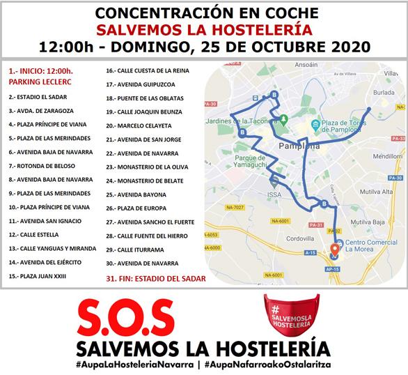 La Asociación de Hostelería y Turismo de Navarra convoca una concentración en coche para este domingo 25 de octubre en Pamplona, cuyo recorrido partirá a las 12:00 horas desde el parking de Leclerc y llegará hasta el Estadio El Sadar. Objetivo: protestar contra el cierre de la hostelería en nuestra Comunidad.