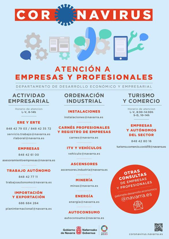 El Gobierno de Navarra distribuye este listado de contactos públicos de aquellas áreas de interés para empresas y profesionales durante esta crisis, relacionados con Actividad empresarial, Ordenación industrial y Turismo y comercio.