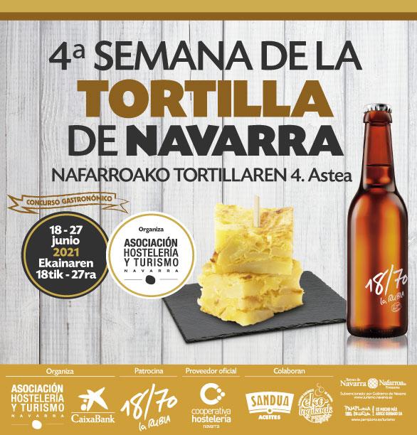 La Asociación de Hostelería y Turismo de Navarra organiza del 18 al 27 de junio la 4ª Semana de la Tortilla de Navarra, evento que este año reúne a 24 de nuestros establecimientos y tiene como objetivos principales promocionar el pincho de la tortilla de patatas, con origen navarro, y a los establecimientos que ofertan este pincho tan nuestro. Este evento además cuenta con la colaboración de CaixaBank, Heinneken, la Cooperativa de Hostelería como proveedor oficial, CPAEN, Aceites Sandúa, el Gobierno de Navarra y el Ayuntamiento de Pamplona.