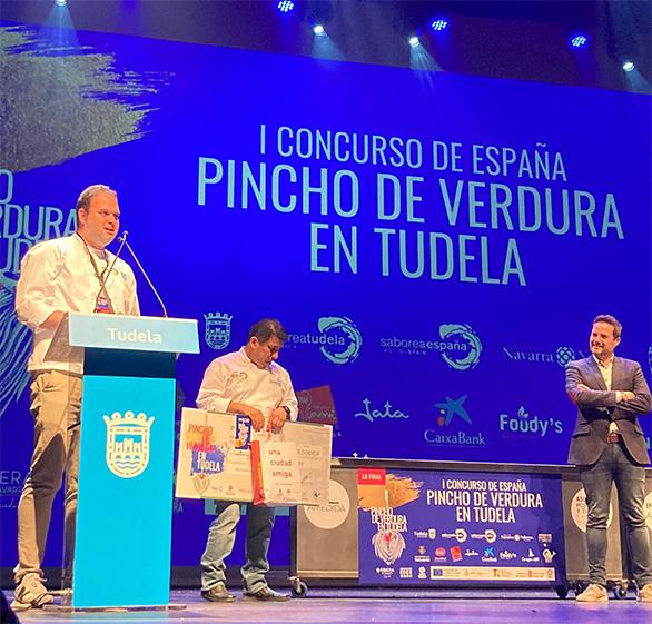 José Aguado, del restaurante Topero de Tudela, con el pincho La evolución de la cebolla ha ganado el I Concurso de España de Pincho de Verdura de Tudela, dotado con 3500 euros más trofeo, cuya competición se llevó a cabo, en la mañana de ayer en el teatro Gaztambide de Tudela, en un acto público con los diez finalistas previamente seleccionados. El segundo puesto fue para Verónica Montespier, del restaurante La Huerta de Chicha de Pamplona, con el pincho Gubia, que se lleva 1500 euros y un trofeo. Y el tercero para Julen Pérez, del restaurante Kiska de Ermua, con el pincho Raíces, por el que ha recibido 1000 euros más trofeo.