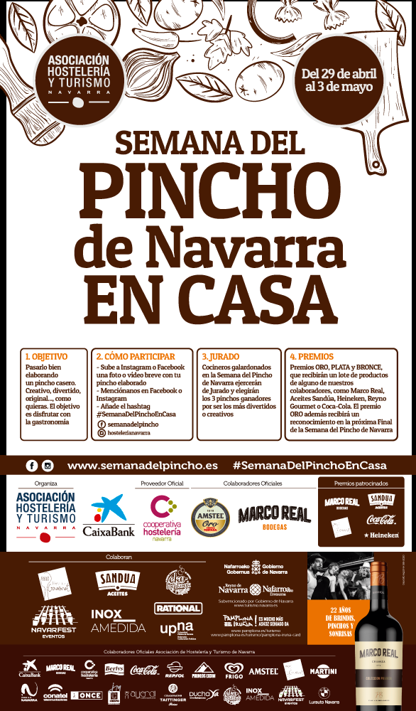 La Asociación de Hostelería y Turismo de Navarra organiza LA SEMANA DEL PINCHO DE NAVARRA EN CASA, que comienza mañana día 29 de abril y finalizará el 3 de mayo.