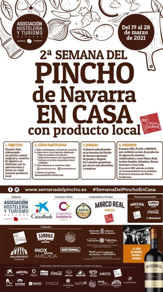 La Asociación de Hostelería y Turismo de Navarra organiza la II SEMANA DEL PINCHO DE NAVARRA EN CASA CON PRODUCTO LOCAL, que comienza el próximo 19 de marzo y finalizará el próximo día 28 de marzo. El objetivo es que el público entusiasta, aficionado, amante de la cocina y no profesional del ámbito hostelero participe, elaborando un pincho casero, creativo, divertido, original