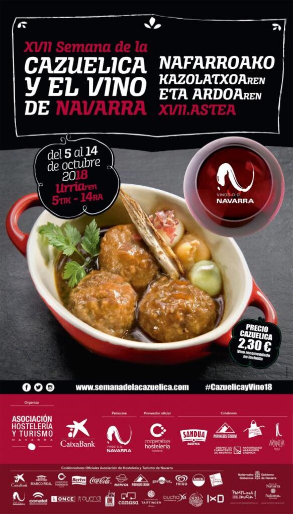 Desde la Asociación de Hostelería y Turismo de Navarra estamos preparando la decimoséptima edición de la XVII Semana de la Cazuelica y el Vino D.O. Navarra. Este año tendrá lugar del 5 al 14 de octubre próximo y se presentarán las elaboraciones, como en años anteriores, acompañadas y maridadas con un vino de la D.O. Navarra.